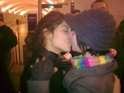 Várias pessoas juntaram-se esta sexta-feira ao fim da tarde na estação de metro da Baixa-Chiado, em Lisboa, para trocarem beijos contra o repúdio pela recusa da publicidade da rede social gay Manhunt nos espaços publicitários daquela rede de transportes.
