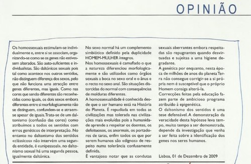Boa tarde. Após ter tomado conhecimento dum artigo de opinião publicado na revista da Ordem dos Médicos, referenciado no site Dezanove (http://dezanove.pt/141345.html), venho por este meio expressar a minha condenação, desagrado e repúdio ao conteúdo desse mesmo artigo, ao seu autor – William H. Clode, chefe do serviço hospitalar do Instituto Português de oncologia – e aos indivíduos da Ordem responsáveis pela publicação do mesmo. Trata-se de um artigo homofóbico mascarado de verdade científica, sendo que até nesse campo é confuso e sem fundamentos, tornando-o assim numa simples opinião preconceituosa, onde até o tom das palavras utilizadas o denunciam. Eis as razões pelo qual assim o considero: